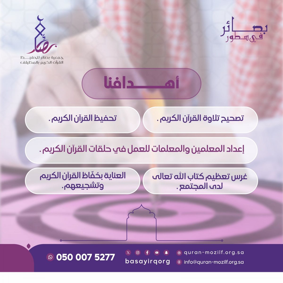 فأفيدكم حفظكم الله بخصوص الجمعية الخيرية لتحفيظ القرآن الكريم بالمظيلف - محافظة القنفذة ودورها الكبير في الدعوة إلى الله بما تقوم به من المشاريع والمناشط وغيرها من البرامج التي تهدف إلى تخريج حفظة كتاب الله الذي وصل عددهم حتى الآن ٢٢٦٥ طالب وطالبة، وتسعى الجمعية لإكمال بعض المشاريع التي هي في أمس الحاجة لها منها (مشر..